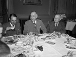 Mr. Carter's 60th Birthday Party. Left to right, Dr. Hodges McKnight, Amon Carter, and Dr. Webb Walker. The men are sitting at the dining table and are eating food. They are wearing suits and ties. They have plates of food, drinks and desert on the table. Mr. Carter his smiling as he looks slightly to his side. He has his fork in his right hand raised slightly above his plate. Dr. Walker is also smiling as he looks to the side while Dr. McKnight has his tea cup in his right hand raised up and it seems he was about to take a sip.