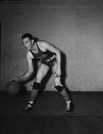Jack Thornton is the giant of the Texas Wesleyan University basketball team. He stands six-foot-five-inches and plays both Center and Forward. He is being moved up to the first team, where his chief duties will be taking the ball of the backboards and working it up the floor. He is shown dribbling the basketball with his right hand. Thornton is dressed in a basketball uniform with number 99 on the front, striped knee high socks, and kneepads.