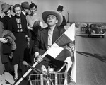 Olin T. Sealy holds a Finnish flag after he completed a bicycle stunt on E. Belknap bridge as spectators look on; the proceeds go to the Finnish war relief fund, 12/16/1939