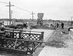 Pavement being poured on the south lane of Easter Lancaster Avenue while Texas State Highway Department representatives check materials, Fort Worth, Texas.