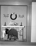 Christmas poster hanging at the new Fort Worth Public Library, 9th and Throckmorton, wreath and stockings hung on fireplace, 12/18/1939