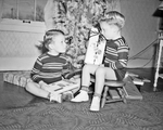 Bill and Bob O'Donohoe, twin sons of Mr. and Mrs. Bob O'Donohoe, Harley St., Fort Worth; examine packages under the Christmas tree.