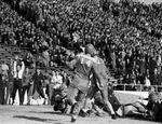 Woodrow Wilson High School and Lubbock High School football action. Joe Tyson (#77) of Lubbock is tackled to the ground.