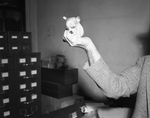 Peanut, 3-month-old chihuahua puppy, in hand of Dr. H.R. Allmon who is treating the puppy, owned by Mr. and Mrs. Forrest Dunlap of Midlothian.