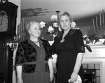 Mrs. Leonard Withington, right, with house guest Florence Paul of York Village, Maine. The women are standing in front of a fireplace, both are wearing dresses. On top of the mantle is a trailing plant, a bouquet of flowers and two candlesticks.