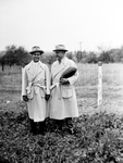 Amon Carter Sr. and Amon Carter Jr. looking at a watermelon which they found growing under a hedge on the Carter estate. They are both dressed in an overcoat on their outfit with pants and a hat. Mr. Carter Jr. has is hands to his side and he his looking towards the camera and smiling while Mr. Carter Sr. has a watermelon in his left hand and his right hand dropped to the side. Mr. Carter Sr. is smiling and looking sideways at his son.