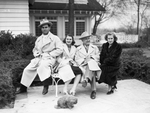Left to right, Amon Jr. , Ruth, Mr. and Mrs. Amon Carter Sr. The carter family. They are seated outdoor on a bench. They are all wearing the same design and color of overcoat on their outfit except Mrs. Carter who is wearing an entirely different design. The men are also wearing hats and their Pekinese dog is on the floor curled up in front of them
