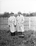 Amon Carter (right) and Amon Carter Jr. standing in a field on the Carter estate next to a watermelon they found growing underneath a hedge. Both men are wearing overcoats and hats.
