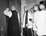 Bishop Harry T. Moore, Dallas, Texas (left) Rev. Louis F. Martin, rector of Saint Andrews Episcopal Church, and four acolytes (left to right) Melvin Cooper, Billy Gupton, Bob Warnken and Frank Lynch.