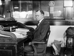 Marvin D. Evans sitting at a desk. Mr. Evans served on the Fort Worth City Council, was a member of Rotary Club and Texas Wesleyan University Board.