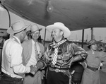 Paul Whiteman in white western hat and silk shirt greeting others at Ranch near Stamford, Texas, ca. 1936