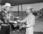 Paul Whiteman in white western hat (left) enjoying a barbeque lunch at a ranch near Stamford, Texas, ca. 1936