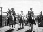 Paul Whiteman on horseback (left) with other horsemen coming out of a corral at a ranch near Stamford, Texas, ca. 1936