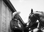 Paul Whiteman standing at the head of his horse at Stamford, Texas, ca. 1936