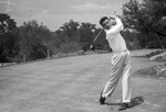 Jack Grout, golfer at Fort Worth's Colonial Country Club Invitational Golf Tournament, 05/1936.He is holding the golf stick in movement. He is dressed in a golf uniform.