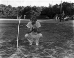 Wally Walker, star catcher of Commercial Standard, one of Fort Worth's strongest softball clubs, 07/1936. The image shows Walker demonstrating a catcher's stance.