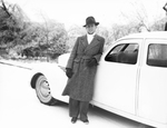 Informal shot of Amon Carter Jr. after his Christmas vacation in Fort Worth, Texas. Carter Junior is standing outside in the snow and he is leaning on the hood of a car. He is wearing a coat, pants, and a hat. He is smiling.