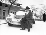 Informal shot of Amon Carter Jr. after his Christmas vacation in Fort Worth, Texas. Carter, Junior is kneeling outside in the snow in front of a car. He is wearing a coat, pants, and a hat. He is smiling. There is a house in the background.