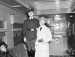 Informal shot of Amon Carter Jr. (center) and his parents at his return to Culver Military Academy after Christmas vacation in Fort Worth, Texas. Amon Carter Jr. is standing on a seat, wearing a military uniform. His father, Amon Carter Sr., is standing beside him. Amon Carter Sr. is holding a cigar in his left hand and has his right hand wrapped around his son's waist. Mrs. Nenetta Burton Carter is sitting at the left. She is wearing a fur coat and a hat.