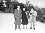 Informal shot of Amon Carter Jr., his mother Mrs. Nenetta Carter and his sister Ruth Carter, at Carter Junior's return to Culver Military Academy after his Christmas vacation in Fort Worth, Texas. The family is standing outside in the snow. Mrs. Carter and Ruth are holding pets. Carter Junior and his mother are wearing coats and hats. Ruth is wearing a fur coat, a hat and pants.