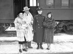 Informal shot of Amon G. Carter Sr., his wife and two children, Carter Junior and Ruth, at Carter Junior's return to Culver Military Academy after his Christmas vacation in Fort Worth, Texas. Amon Carter Sr. and his family are standing outside in the snow in front of a train. Carter Junior is wearing his military uniform. Carter Senior has a cigar in his left hand.