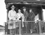 Informal shot of the Carter family at Amon Carter Junior's return to Culver Military Academy after Christmas vacation in Fort Worth, Texas. Standing on a train balcony, left to right, are Amon Carter Sr., Ruth Carter, Amon Carter Jr., and Mrs. Amon Carter Sr. Carter Junior is wearing his military uniform. Carter Senior has a cigar in his right hand.