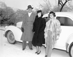 Informal shot of Amon Carter Jr., his mother Mrs. Amon Carter Sr. and his sister Ruth Carter at Carter Junior's return to Culver Military Academy after Christmas vacation in Fort Worth, Texas. The family is standing outdoors in the snow in front of a car. They are all smiling. Carter Junior and Mrs. Carter Senior are wearing coats, gloves and hats. Ruth is wearing a fur coat, a hat and pants.
