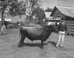 R. J. Peace with Combination Sultan Noble Jersey bull owned by Henry G. Owen, Rochester, first prize winner at Haskell County fair, 11/1937