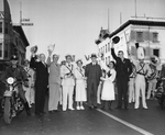 Amon G. Carter among a group of people and TCU Band members, possibly taken during a parade. Don Gillis, Director of the Texas Christian University band, is seen to the immediate right of Carter.