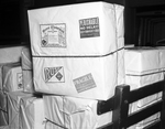 Smoked turkey packaged in boxes, awaiting shipment for Christmas from Amon G. Carter's Shady Oak Farm to recipients like President Franklin Delano Roosevelt, Paul Whiteman, and others.