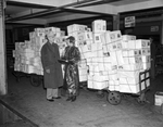 Amon G. Carter and Nenetta Burton Carter with boxes of smoked turkey about to be shipped to friends for Christmas at Shady Oak Farm; recipients include President Franklin Delano Roosevelt, Paul Whiteman, and others.