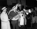 A photograph of Amon G. Carter, Sr. (left) with several unidentified people. There is a man holding a tuba and a woman holding a camera.