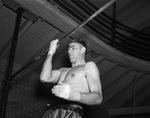 John Hosea, football player for Texas Wesleyan College, works out on parallel bar at Fort Worth's YMCA to get in shape for Golden Gloves light-heavy division competition, 01/1938