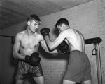 John Hosea, football player for Texas Wesleyan College, spars with fellow gridman, Lem Bray, at Fort Worth's YMCA to get in shape for Golden Gloves light-heavy division competition.