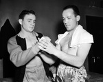 Mack Hood, a boxing instructor at Fort Worth's YMCA, gives pointers to Fred "Susie Q" Smith, an athlete from Poly; both men will be competing in the Golden Gloves competitions, 01/1938