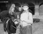 Homer Holcomb with his mule, Parkurkarkas, and his monkey, performers at Fort Worth Stock Show, 02/1938