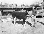 Dale Priaur of Kerrville with Polled Hereford Bull at Houston Fat Stock Show, 02/1938
