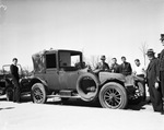 Pictured is an ancient Renault owned by Lawrence Coppage. It will be entered into the "Old Car Contest" at the Spring Automobile Show, Will Rogers Memorial Coliseum. The automobile is parked at a curb. A young boy stands near the back of the car while a group of men and one young boy stand at the front of the car. A policeman stands at the far left of the photograph.