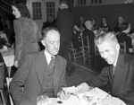 Annual banquet of Haskell Chamber of Commerce; from left, C. R. Thomas, mayor of Stamford, and Rev. R. N. Huckabee, pastor of Haskell Methodist Church, 02/1938. The two men are seated at a table. Reverand Huckabee is showing Mayor Thomas a piece of paper.