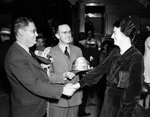Fort Worth's Southwestern Exposition and Fat Stock Show Roundup Club tour through East Texas; John Maxwell (left) and Gilbert Wilson greeted by Mrs. Harold Bugbee of Clarendon, 02/1938