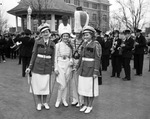 Fort Worth Southwestern Exhibition and Fat Stock Show Roundup Club tour of East Texas; Drum Major Tom Barber of Texas Christian University (T. C. U.) Band with Plainview High School band girls, Betty Jo Blockson, Virginia Hall, and Madge Alden Boyd, 02/1938