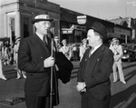 Fort Worth Southwestern Exposition and Fat Stock Show Roundup Club tour through East Texas; E.H. Speer talking at microphone; Sweetwater Mayor Luther M. Watson (right), 02/1938