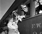 Fort Worth Southwestern Exposition and Fat Stock Show Roundup Club tour; at Childress, Jim Thatene with dog talks with Bradley Burks (leaning out window), 02/1938