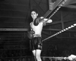 In-State Golden Gloves tournament at Will Rogers Memorial Coliseum, Noah Valadez of Abilene, bantamweight boxer expected to win the championship. Noah is standing in the boxing ring resting his hands on the ropes. He is shirtless and is wearing boxing gloves and shorts, 02/1938