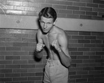 Bobby Hackney, Arlington Heights High School athletic star, defends his lightweight championship in Fort Worth's Golden Gloves tournament. He is standing wearing only shorts in front of a brick wall and is posed with his fist clenched ready to throw a punch, 02/1938