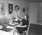 Miss Veronica Helfensteller, artist, (left) and Mrs. Hunter Pendleton of Junior League. Mrs. Pendleton is serving some tea to Mrs. Helfensteller.