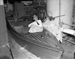 Jack Farrell sits in a boat in the basement of the Fort Worth Hotel.