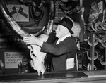 At Fort Worth's Southwestern Exposition and Fat Stock Show; 90-year-old Confederate veteran, L. N. Baugh, inspects Brahma horns displayed at the Commercial Exhibit building, 03/1938