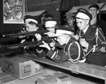 At Fort Worth's Southwestern Exposition and Fat Stock Show, members of the Atlanta High School Band engage in target practice at gun booth; from left, Buddy Williams, Billy Williams, Robert Dupree Junior, and Frank Trice eats snow cone, 03/1938