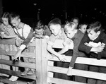 At Fort Worth's Southwestern Exposition and Fat Stock Show, Children's Day; at sheep exhibit, from left, Betty Joe Brown, Charles David Weeks, Howard Hughes, Wayne Lucas, Harry Moon, and Dan Cushman, 03/1938